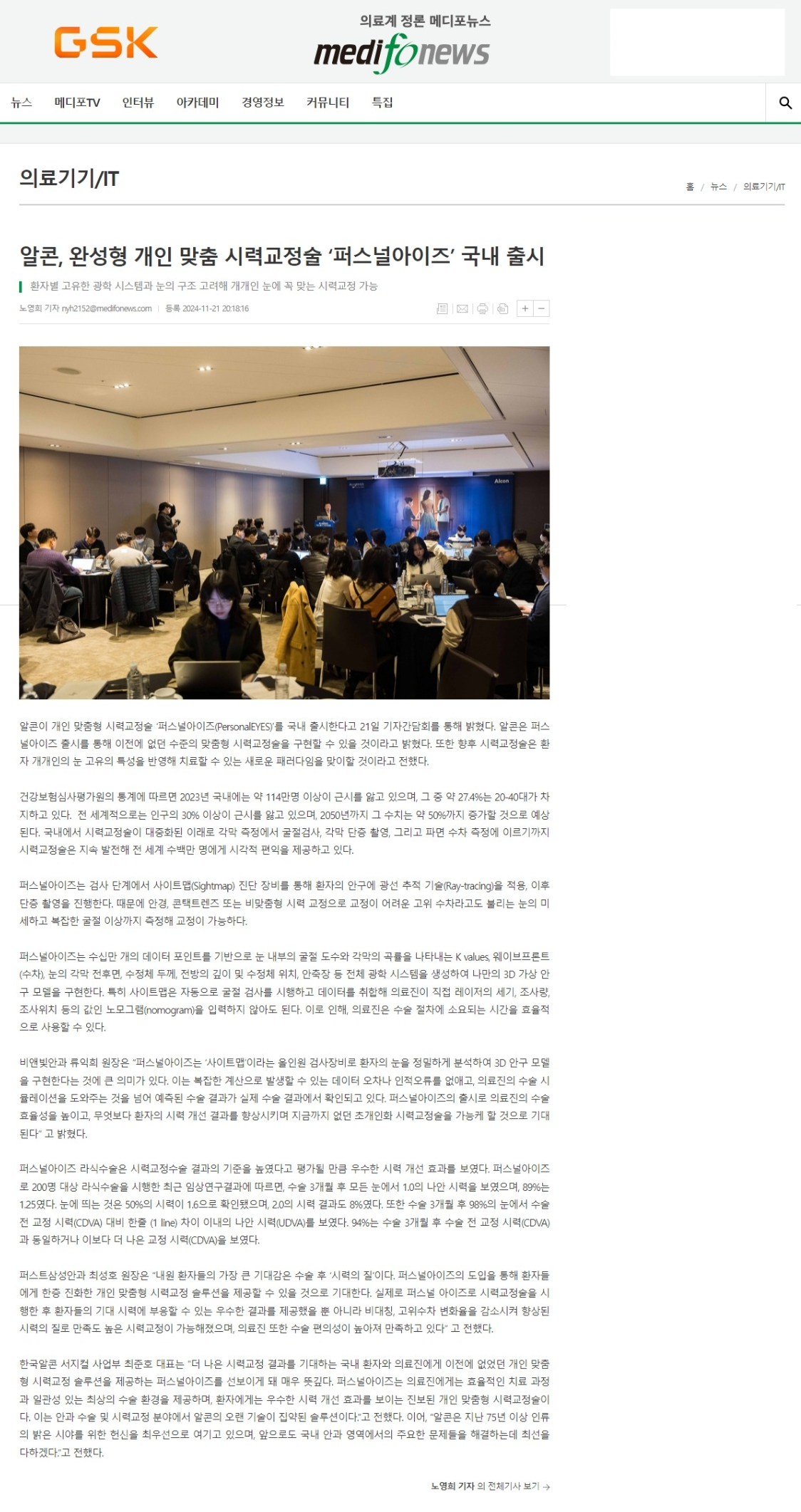 [데일리팜] "개인맞춤형 3D 모델 시력교정술 퍼스널아이즈" 최성호 원장 알콘사 간담회서 소개