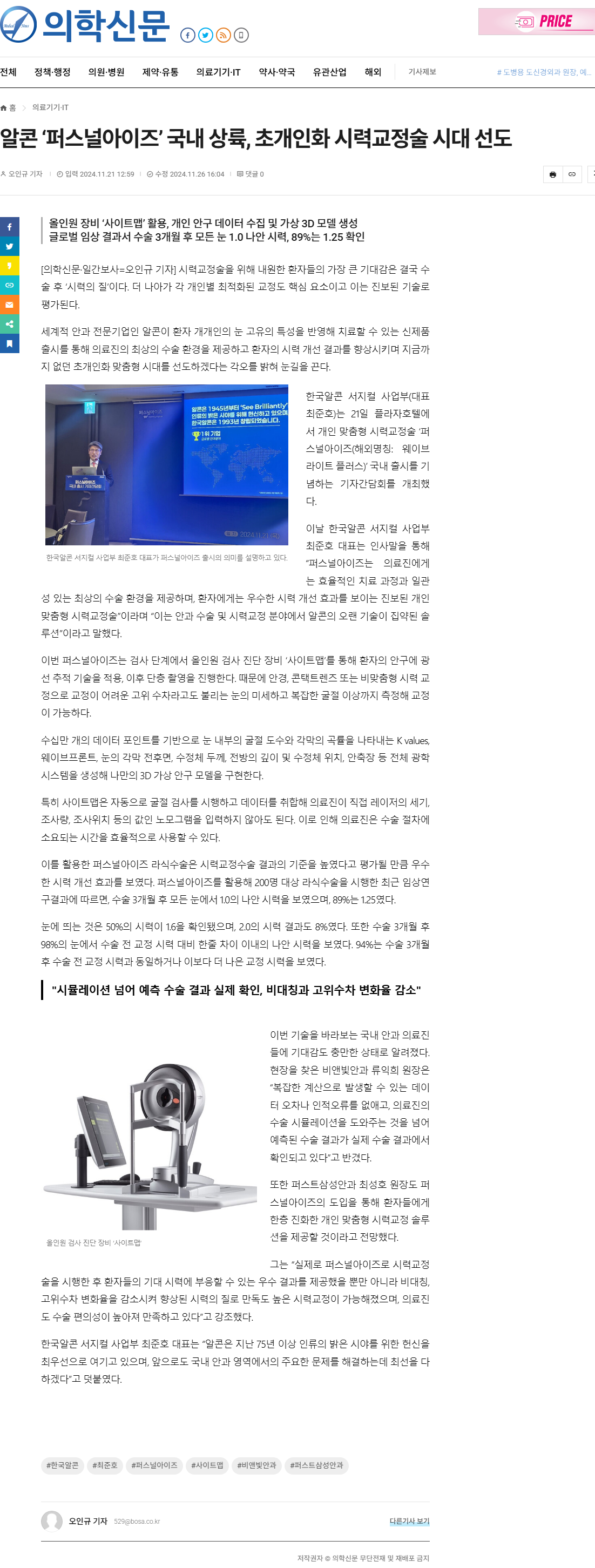 [의학신문] 알콘 ‘퍼스널아이즈’ 국내 상륙, 최성호 원장 초개인화 시력교정술 '퍼스널아이즈' 소개